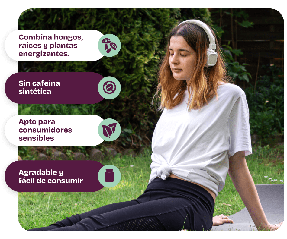 1. Estimular la energía mental sin cafeína artificial, gracias a la combinación sinérgica de Guaraná, Té Verde, Maca y Cordyceps.